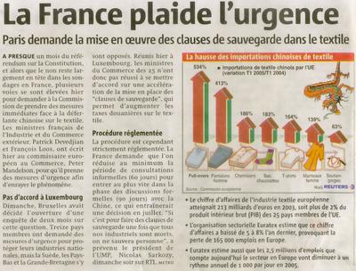 Voyons maintenant, avec cet article de Métro, un exemple de modèle socialiste, ou plutôt communiste, donc celui de la Chine avec les textiles chinois. Disons juste avant de commencer que la Chine est à 9,3 % de croissance pour 2004.